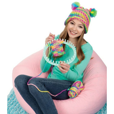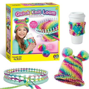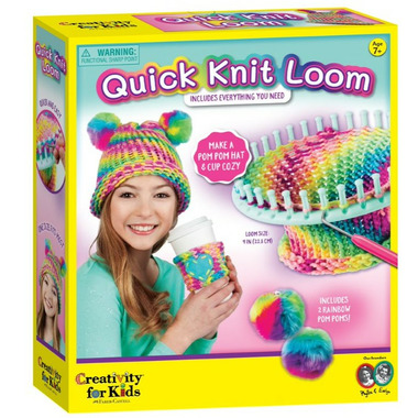 Unlike traditional knitting or crochet, this quick knit loom is so simple to use. No special skills required -simply wind the yarn around the 9 inch round loom. Kit features chunky rainbow yarn, faux-fur rainbow pom poms, easy to use tools and all the accessories need to make a quick pom pom hat and cup cozy.