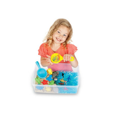 Foster imaginative play with the Ocean & Sand Sensory Bin. This self-contained play bin is the ultimate sensory experience. Develop and practice fine motor movement with scooping, sifting and playing in this self-contained beach environment. Includes easy to shape and mold Sensory Sand and fascinating water beads. Also includes sand sifter, scoop, sand molds, ocean animals and river rocks. Conveniently packed in a bin with lid for easy storage.