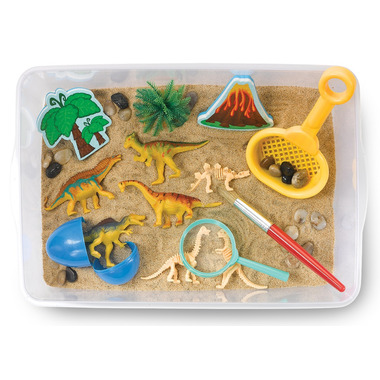 Foster imaginative play with the Dinosaur Dig Sensory Bin. This self-contained play bin is the ultimate sensory experience. Develop and practice fine motor movement with scooping, sifting and brushing fossils in this self-contained dinosaur dig environment. Includes magnifying glass, foam volcano, fossil brush, play sand, faux plant, sand sifter, dinosaurs, skeletons and more! Conveniently packed in a bin with lid for easy storage.