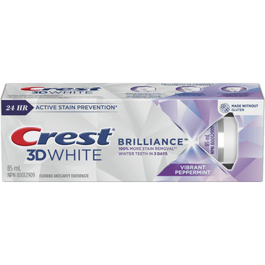Crest 3D White Brilliance Toothpaste whitens teeth by removing 100% more surface stains in 3 days. This Crest 3D White toothpaste has 24-hour stain protection when paired with twice-daily brushing. The brilliance toothpaste formula contains fluoride that helps fight cavities while whitening teeth by micro-cleansing each tooth and removing surface stains. From America's #1 Whitening Brand* *P&G calculation based on U.S. reported sales data for yr ending w/o 6/11/22 ƆVs. regular toothpaste.