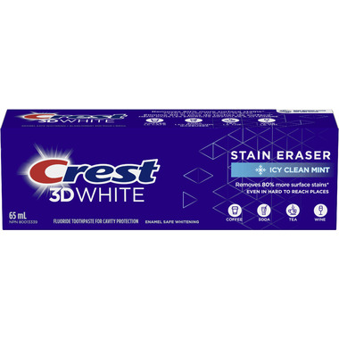 Brighten your smile with Crest 3D White Stain Eraser Toothpaste in Polishing Mint flavor. This Crest toothpaste helps to remove 80% more surface stains* caused by tea, coffee, soda, wine, and other beverages. This formula is gentle on enamel and helps protect against cavities while leaving breath minty fresh. *Vs regular toothpaste.