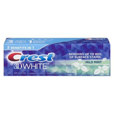 Brighten your smile with Crest 3D White Mild Mint Whitening Toothpaste. It whitens your teeth by removing up to 80% of surface stains and protects against future stains for a noticeably whiter smile. 3D White fluoride toothpaste strengthens your tooth enamel and helps protect against cavities. It also provides an mild mint burst of freshness that lasts after brushing.