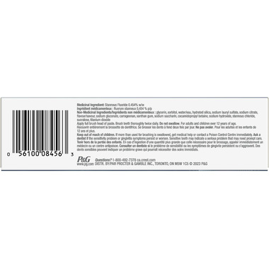 Medicinal Ingredient: Stannous Fluoride 0.454% w/w Non-Medicinal Ingredients: Glycerin, Sorbitol, Water, Hydrated Silica, Sodium Lauryl Sulfate, Sodium Citrate, Flavour/Saveur, Sodium Gluconate, Carrageenan, Xanthan Gum, Sodium Saccharin, Cocamidopropyl Betaine, Sodium Hydroxide, Stannous Chloride, Sucralose, Titanium Dioxide
