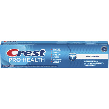 Try Crest Pro-Health Whitening Toothpaste for protection against areas dentists check most with the highest level of Crest Pro-Healths whitening ingredient to remove surface stains*. Crest Pro-Health Whitening Toothpaste reaches 100% of the whole mouth to protect against plaque bacteria that lead to gingivitis. With patented stannous fluoride technology, Crest Pro-Health Whitening Power promotes healthy teeth and gums by providing 8 advanced benefits in 1, including protection against cavities, gingivitis - an early stage of gum disease, sensitive teeth, acid erosion, tartar, plaque + whitening and fresh breath. *vs. Crest Pro-Health Clean Mint Toothpaste
