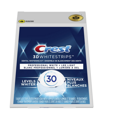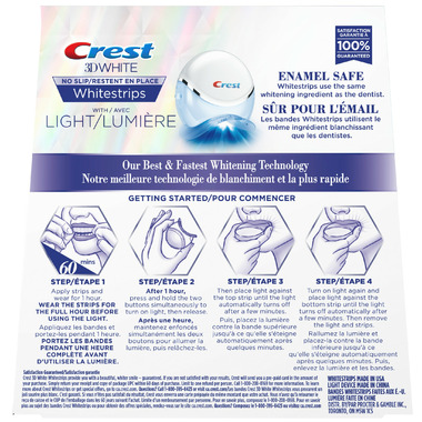 Want to whiten teeth at home? Crest 3DWhitestrips Professional White + LED Accelerator Light is designed to whiten like a professional-level teeth whitening treatment at home. The LED Accelerator Light works to weaken stains so that the whitening ingredients inside Crest 3DWhitestrips can work more effectively to remove stains. In fact, this technology works just like the LED teeth whitening technology dentists use. Plus, the Advanced Seal Technologys comfortable, no-slip grip means the strips stay put until you take them off, allowing you to talk and even drink water while whitening your teeth. Crest 3DWhitestrips Professional White + LED Light will give you a 100% noticeably whiter smile, guaranteed. This enamel-safe, at-home teeth whitening kit will make your teeth 30 levels whiter. Simply apply Crest 3DWhitestrips Professional White for 60 minutes a day (plus 5 minutes for the LED Accelerator Light) for 19 days. This pack includes 38 teeth whitening strips, 19 for your top teeth and 19 for your bottom teeth, and a wireless LED accelerator Light to be used over the course of 19 days.