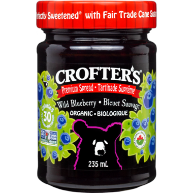 With only 30 calories per serving, Crofter's fruit spreads have 33% less sugar than a traditional jam, which means you get more fruit and less sugar with every tasty bite! Their wild blueberries are harvested in Québec and are more petite and flavour packed than the variety found at your neighourhood grocery.