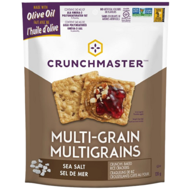 Crunchmaster Multigrain Sea Salt Crackers are crunchy, baked rice crackers made with olive oil.