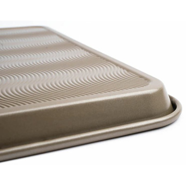 Ideal for sweet and savory baking and cooking! Thick carbon steel for performance, stability, and durability. Straight side walls and seamless design for easy removal of food from the pan and cleaning. Premium two-layer non-stick coating for excellent release of foods. Textured wave bottom increases airflow for even baking and browning.
