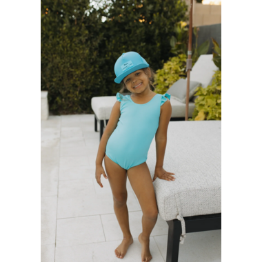 The Ruffle Shoulder One Piece swimsuit features Chemical Free UPF 50+ Protection in the sweetest swimsuit design around. The body of the swimsuits are fully lined for modesty, with a soft inner liner. Added snaps to the infant sizes up to size 12/24m for easy diaper changes. The outer shell of the suit is made from an ultra soft + breathable Lycra fabric providing 4-way stretch for all day comfort and play. This swimsuit has an easy on and off design with the ruffle shoulder adding a feminine touch and extra sun protection to the shoulder area. The perfect swimsuit for everyday wear, or for little ones who prefer their suit without arms.