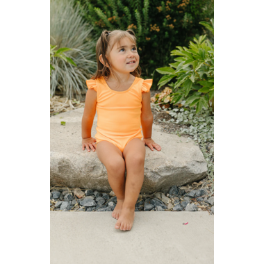 The Ruffle Shoulder One Piece swimsuit features Chemical Free UPF 50+ Protection in the sweetest swimsuit design around. The body of the swimsuits are fully lined for modesty, with a soft inner liner. Added snaps to the infant sizes up to size 12/24m for easy diaper changes. The outer shell of the suit is made from an ultra soft + breathable Lycra fabric providing 4-way stretch for all day comfort and play. This swimsuit has an easy on and off design with the ruffle shoulder adding a feminine touch and extra sun protection to the shoulder area. The perfect swimsuit for everyday wear, or for little ones who prefer their suit without arms.