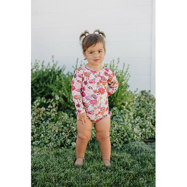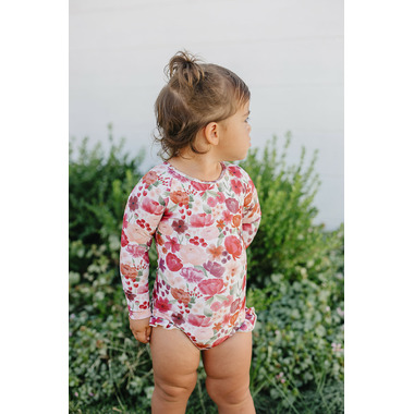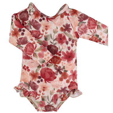 Ruffle Rashguard Suits offer Chemical Free, UPF 50+ Protection, in the sweetest designs around. The body of our swimsuits are fully lined for modesty, whereas the arms are left unlined to ensure full mobility. The shell of the swimsuit is made from our ultra soft + breathable Lycra fabric, providing 4-way stretch for all day comfort and play. These swimsuits conveniently come with crotch snaps in sizes up to 24M for easy diaper changes.