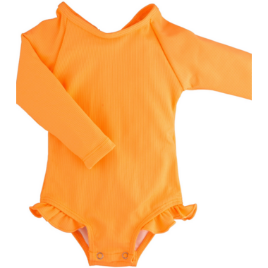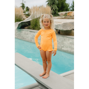 Ruffle Rashguard Suits offer Chemical Free, UPF 50+ Protection, in the sweetest designs around. The body of our swimsuits are fully lined for modesty, whereas the arms are left unlined to ensure full mobility. The shell of the swimsuit is made from our ultra soft + breathable Lycra fabric, providing 4-way stretch for all day comfort and play. These swimsuits conveniently come with crotch snaps in sizes up to 24M for easy diaper changes.