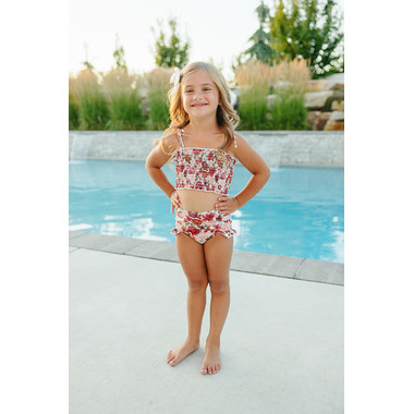 Introducing the Smocked Bikini Set featuring an adjustable lengthened smocked top with high waist ruffle hip bottoms. Made from ultra soft Lycra blend fabrics, these bikinis move + stretch to fit your little one exactly as they need with a silky fully lined interior.