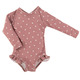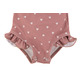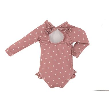 The Ruffle Rashguard Suits offer full Chemical Free UPF 50+ Protection in the sweetest design around. The body of our suits are fully lined for modesty with an ultra soft liner, and the arms are left unlined to ensure full mobility. The shell of the suit is made from ultra soft + breathable Lycra fabric providing 4-way stretch for all day comfort and play. Soft and sweet, the "Charlotte" print is the minimal suit of your dreams. This beautiful print features hand drawn hearts arranged on a matte pink base. Neutral in style, this print layers very well and pairs with both soft and bold accessories.