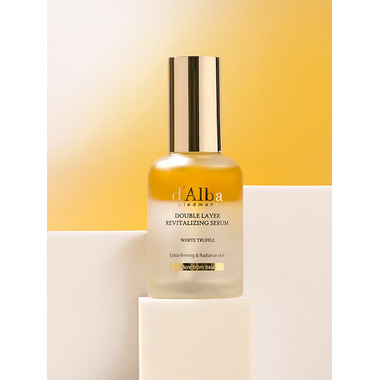 d'Alba White Truffle Double Layer Revitalizing Serum is a vegan-friendly, dual-phase oil-serum blend (30% plant-based oil layer + 70% nourishing serum layer) designed to deliver hydration and help the skin appear smoother and more even in tone. The formula features white truffle extract paired with vitamin E.