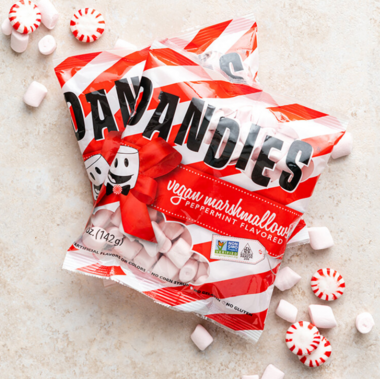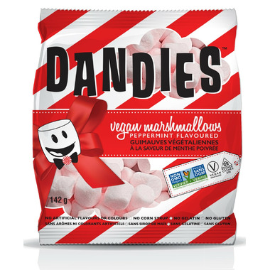Dandies vegan peppermint flavored marshmallows are made with plant-based ingredients. Enjoy Dandie Peppermint Marshmallows in hot cocoa, holiday baking, and snacking right out of the bag!