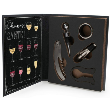 This stainless steel 5-piece Wine Tool Set is perfect for any wine lover. Ideal for use at home or as a gift. Includes a bottle opener/corkscrew, wine pourer, drip catcher, wine stopper and foil cutter. Beautifully and neatly packaged in a book-style gift box for easy storage in a drawer or on a shelf.