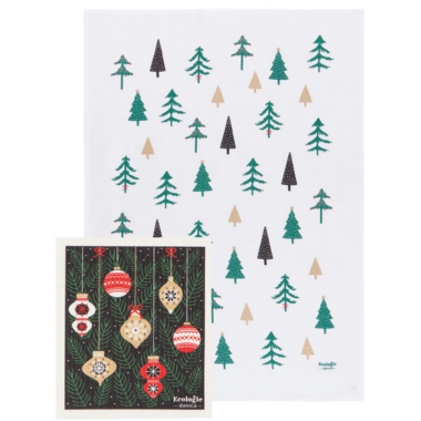 Let nature help with trimming your home for the holiday season when you display this dishtowel and sponge cloth set by Ecologie in your kitchen. The festive colors of fir trees and shiny decorations help you bring a Festive Forest to your kitchen.