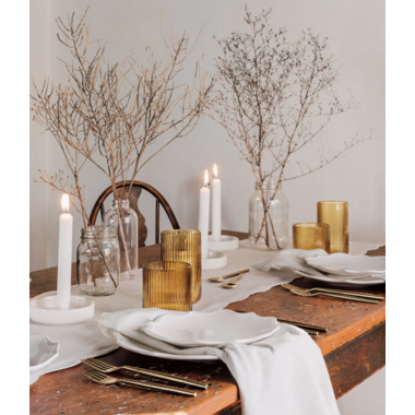Drink in the delicate ridges and crystal clear, smoky, or topaz tones of this modern glassware collection.