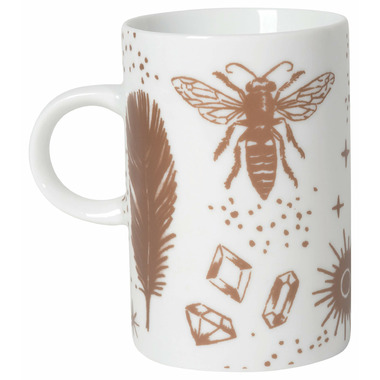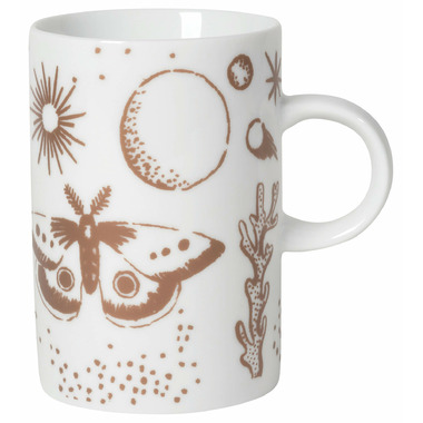 This tall porcelain mug is a sure-fire conversation starter. Mystical objects and celestial wonders capture curiosity. Study the intricate wings of a moth or the faceted edges of brilliant gemstones.