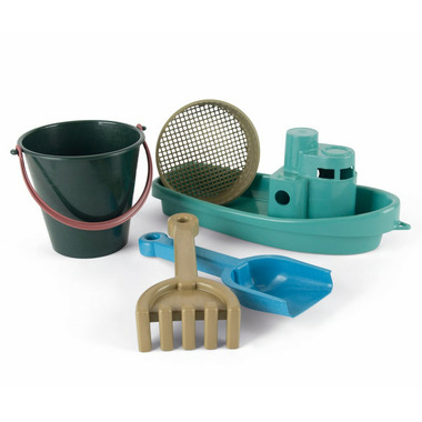 The Blue Marine Toys boat and sand set comes in a convenient 5-piece set that is perfect for hours of creative play at the beach or in the sandbox. The set includes a charming turquoise boat, a green bucket, a blue shovel, and a beige rake, all designed for small adventurous hands.