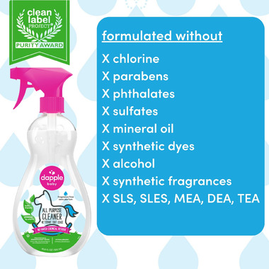 • MINDFUL INGREDIENTS: Dapple Baby products have received the top award for purity from the Clean Label Project for clean and pure ingredients. Dapple All Purpose Cleaner is pediatrician and dermatologist tested, hypoallergenic, made with plant powered ingredients and without parabens, sulfates, phthalates, mineral oil, synthetic dyes & fragrances, chlorine, alcohol, SLS, SLES, MEA, DEA, TEA.