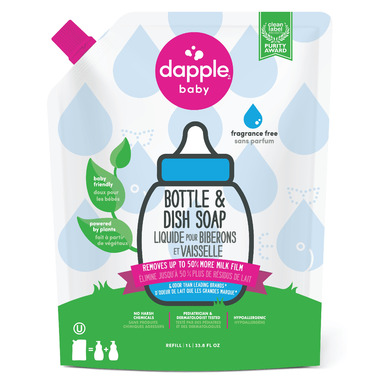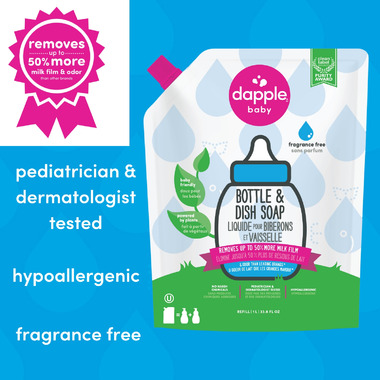 Independent tests prove that Dapple Baby Bottle & Dish Soap removes up to 50% more milk film and odor than other leading brands.* It is specifically formulated to remove the fats, proteins and carbohydrates left behind by breast milk and formula so it rinses cleaner, and uses baking soda to combat any odor. It does so much more than just clean bottles – use it on all your dishes, for babies, children and the rest of the family too.