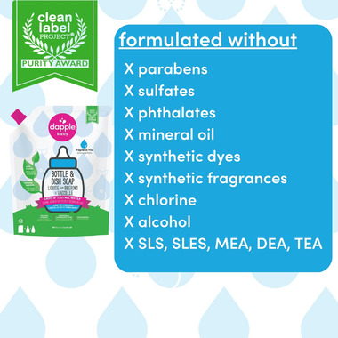 - MINDFUL INGREDIENTS: Dapple Baby Bottle & Dish Soap is a Clean Label Project Purity Award Winner for clean and pure ingredients, is pediatrician and dermatologist tested, hypoallergenic, made with plant powered ingredients and without parabens, sulfates, phthalates, mineral oil, synthetic dyes & fragrances, chlorine, alcohol, SLS, SLES, MEA, DEA, TEA.