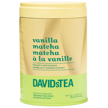 DAVID'S Tea Matcha Tin Organic Vanilla. A naturally flavoured matcha drink mix that is creamy and refreshing. Just add water.