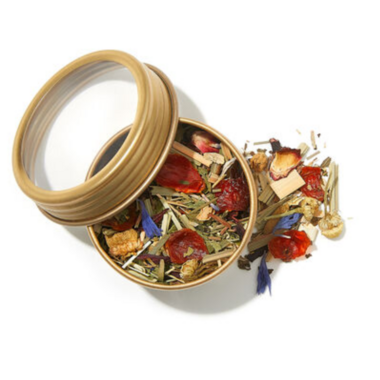 Calming Chamomile (Organic): Organic chamomile from Croatia. Cinnamon Rooibos Chai (Organic): Organic rooibos*, Organic apple, Organic cinnamon, Natural cinnamon flavouring. Earl Grey Rooibos (Organic): Organic rooibos, Organic rosehips, Organic apple, Organic rose petals, Natural (bergamot, mandarin) oil. Headache Halo: Rooibos, Nana mint, Lemongrass, Willow bark, Nettle leaves, Lavender, Passion flower, Vervain leaves, Rose petals, Mallow blossoms. Mother's Little Helper (Organic): Organic peppermint, Organic lemongrass, Organic hibiscus*, Organic rosehips, Organic chamomile, Organic valerian root, Cornflowers, Natural peppermint flavouring. Peppermint Amour (Organic): Organic peppermint leaves from Oregon and Washington State. Silent Night: Rooibos, Orange peel, Cinnamon, Natural orange flavouring, Clove, Allspice, Valerian, Nutmeg, Natural pumpkin pie flavouring, Red cornflower petal. Throat Rescue (Organic): Organic licorice root, Organic fennel, Organic nana mint, Organic anise, Organic ginger, Organic peppermint, Organic nettle leaves, Organic black pepper, Organic cinnamon, Organic cardamom, Organic cloves, Organic marigold blossoms, Organic cornflower blossoms.