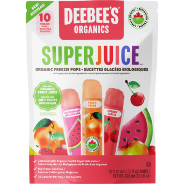 10 ice pops in 3 NEW delicious flavors - Cherry, Peach, Watermelon SuperJuice Freezer Pops are our newest, juiciest, customer requested flavors! Sweetened with 100% fruit juice and no refined sugars, these popsicles are bursting with flavor and feel good ingredients. Try all 3 NEW SuperJuice flavours in our variety pack.