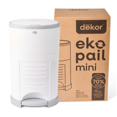 All Dekor Eko Diaper Pails come pre-installed with a full-sized Dekor Eko Refill, now made from 70% GRS-Certified Recycled Plastic! Dekor Eko Mini is the size of a bathroom trash can and is perfect for a grandparents' house or a secondary diaper pail.