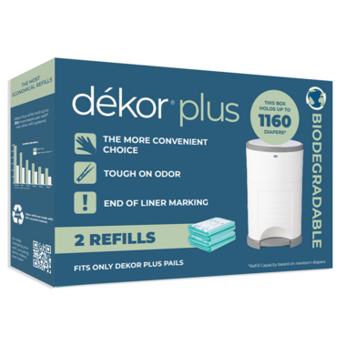 Dékor Refills are one continuous liner so you can empty as often as you want, and they hold more diapers per refill than the competition! Dékor Refills are one long continuous liner with no preset perforations. You control how often you empty the pail and how much refill you want to use. Emptying your diaper pail more frequently will keep odors in your nursery to a minimum. Dékor Biodegradable Refills break down more quickly than the original refills.