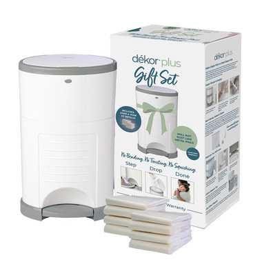 NEW Dekor Classic Gift Set complete with a Hands-Free Dekor Classic Diaper Pail and over a year’s worth of refills. Perfect baby registry gift to help new parents through their 1st year of diapers.