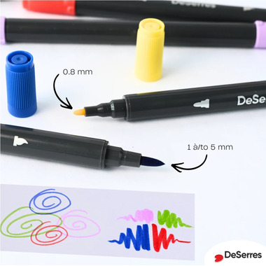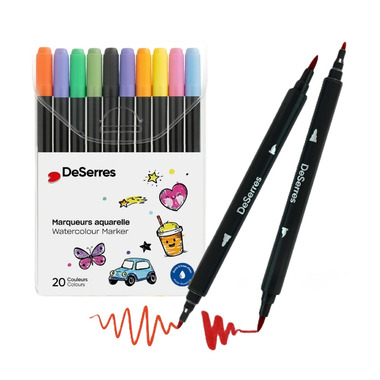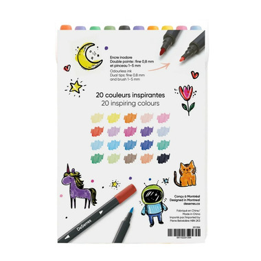 20 colors to spark young artists' creativity! These dual-tip, water-based brush markers are designed for coloring, drawing, and creative projects. The flexible brush tip allows for both fine and broad strokes, making it easy to fill in large areas as well.