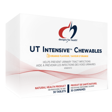 UT Intensive™ Chewables is a powerful blend of whole fruit cranberry extract and D-mannose, which is designed to promote a healthy urinary tract. Cranberry is one of the most widely studied, time-tested, traditional remedies for supporting urinary tract health. Unlike many commercially available cranberry products, which are made from juice or contain individual isolated, health-promoting phytochemicals, the cranberry extract in UT Intensive™ is made from the whole fruit — juice, skins, flesh, and seeds — and therefore contains the full complement of phytochemicals, organic acids, fatty acids, and phenolics. Mannose is a type of sugar found in various fruits and vegetables. The naturally occurring isomer, D-mannose, is similar in structure to certain urinary tract receptors, and thus, functions in a way that helps maintain a healthy environment in the urinary tract. Although D-mannose is a sugar, it is eliminated from the body instead of impacting calorie intake or metabolism, and it does not interfere with blood sugar regulation. This product is presented in great tasting, chewable, orange-flavoured tablets, allowing for easy patient compliance.