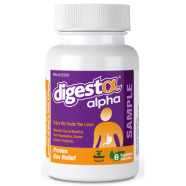 The Digesta Alpha Proven Gas Relief Vegetable Capsules contain natural enzymes that prevent and treat gas and bloating. This product helps prevent symptoms of lactose intolerance (including gas, bloating, cramping and diarrhea) - it contains a digestive enzyme/lactase to assist in the digestion of foods containing lactose (e.g. dairy foods, milk). Also, this product helps reduce gas production/flatulence following meals rich in fermentable carbohydrates (such as vegetables, pulses, beans, legumes and whole grains and helps prevent gastrointestinal intolerance of oligosaccharides/fermentable carbohydrates.