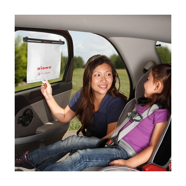 The unique Heatblock Sun Shade impedes sunlight and also repels heat to keep the inside of the car cool and comfortable. The exclusive Diono design features a tightly woven material with a light and heat reflective coating to ensure car passengers will be protected from UVA and UVB rays with the UPF 50+ material. The super lightweight blind is easy to pull down and retract back with a one button rewind. The Heatblock Sun Shade easily attaches to the window with strong suction cups.