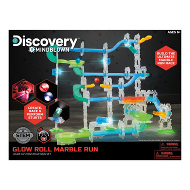 Spark Creativity and Innovation Introduce your child to the fascinating world of construction and physics with the Discovery #Mindblown Glow Roll Marble Run Light-Up Construction Set. This kit combines the excitement of racing with the fun of building, creating a dynamic play experience that entertains and educates. A Spectacle of Light and Motion With two LED marbles, LED tiles, and spotlights included, kids can enjoy their marble runs day or night. The glowing components add an extra layer of excitement and visibility to the intricate paths and spectacular stunts they build. Build and Race The easy-to-assemble tile design not only simplifies construction but also results in sturdier and more reliable tracks. Children can unleash their creativity to design elaborate courses with drops, spins, and jumps, learning fundamental physics principles in the process.