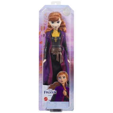 Meet this Anna doll, inspired by the fearless and optimistic heroine from Disney's Frozen 2! This posable fashion doll is shown in her signature travel look, with accessories that include boots and a soft cape and skirt. In her signature outfit from the movie, this Anna doll is ready to embark on a journey far from home! Doll cannot stand alone. Colors and decorations may vary.