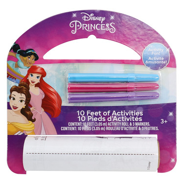 A great portable activity set of endless fun! Unroll 10 feet of Princess activities of fun and colouring. Includes a 10-foot roll of activities, 3 markers, and a sticker sheet.