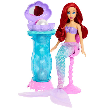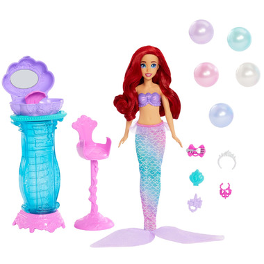 - Mermaid Ariel doll and her vanity filled with pop-up surprises will delight fans of Disney's The Little Mermaid! Inspired by the beloved Disney character, Ariel doll wears a removable soft mermaid tail and has brushable hair for styling fun! Sea-themed vanity contains 5 'pearls,' each containing a unique, surprise accessory.