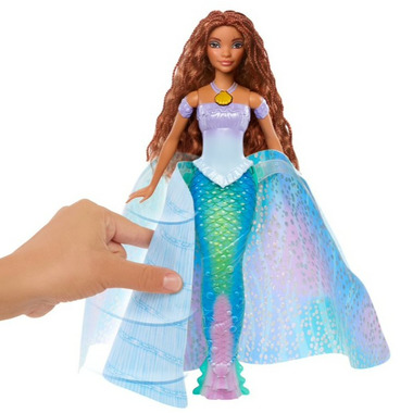 Make a splash with Disney's The Little Mermaid Transforming Ariel doll from the exciting theatrical release. Simply push her shell necklace to see her transform from human to mermaid! Her signature blue dress opens to become a beautiful, multi-coloured mermaid tail. The posable fashion doll features long hair for endless styling fun. Fans can collect all The Little Mermaid dolls and create their own adventures above or below the waves. Each doll sold separately, subject to availability. Doll cannot stand alone. Colours and decorations may vary.