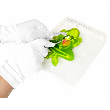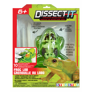 Dissect-It Frog Lab is described as a fun learning activity toy featuring a carvable gelatin frog that contains a 10 pieces skeletal structure including organs. Using the provided tools and dissection table Dissect-It Frog simulates the experience and wonder of the scientific dissection.