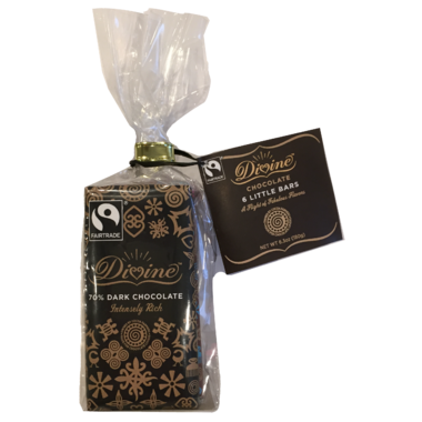 6 mini versions of Divine's favorite flavors in the perfect gift package. Flavors include: 70% Dark Chocolate, 85% Dark Chocolate, Dark Chocolate with Raspberries, Milk Chocolate with Toffee & Sea Salt, Milk Chocolate, and White Chocolate with Strawberries.