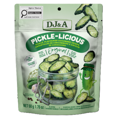 DJ & A Pickle-Licious is a ready to eat snack that is all natural, plant based, a high source of dietary fibre and has at least 50% less fat than regular potato chips. It contains no artificial colours, flavours or preservatives. All palm oil used is sustainable.