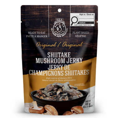 Shiitake Mushroom Jerky- Original. Shiitake Jerky is ready to eat snack that is plant based and an excellent source of dietary fibre.