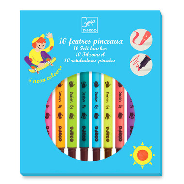 Because creating with good tools makes activities easier and more beautiful, these 10 double ended, brush-tip felt pens in bright colours are a must have for any project. Ages: 6+