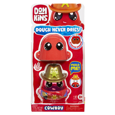 Saddle up with your DohKins Cowboy for a playtime full of adventure and creativity! This new friend is made with the Never-Dry Dough that always stays soft, is gluten-free, and smells great – perfect for sculpting and squishing. Use the included character mold and accessories to create your cowboy, or shape the dough into anything you can think of!