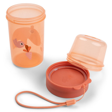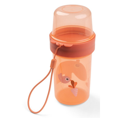 Let a Deer friend keep your food fresh and crispy with this large to go 2-way snack container. Bring along two different snacks in the same leakproof container to cheer up the day. It is perfect for a weekend picnic or for lunch in preschool and beyond. Use the lower half of the air-tight snack container for vegetable sticks or fruit chunks and the upper half for dips or berries. The container comes with a practical carry strap and is suitable for the microwave and dishwasher safe. Pack a delicious lunch snack and let our Deer friends watch over it. On the front of this papaya coloured container Ozzo enjoys a strawberry and on the back Birdee flies off with a freshly picked carrot.